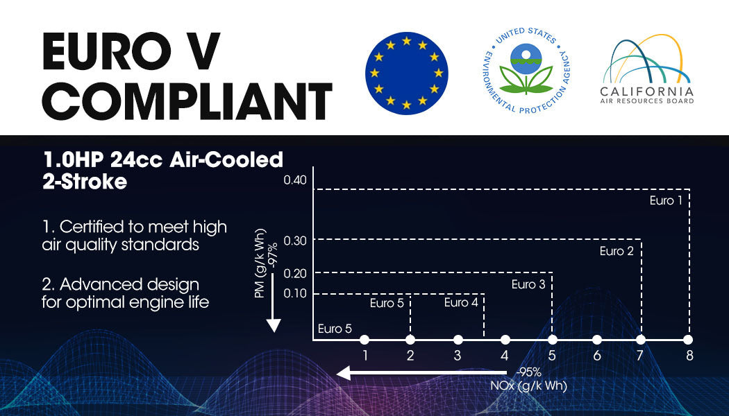 The 24cc full-crank 2-stroke engine offers power, efficiency and low emissions, and accordingly it meets the strict Euro V standard.