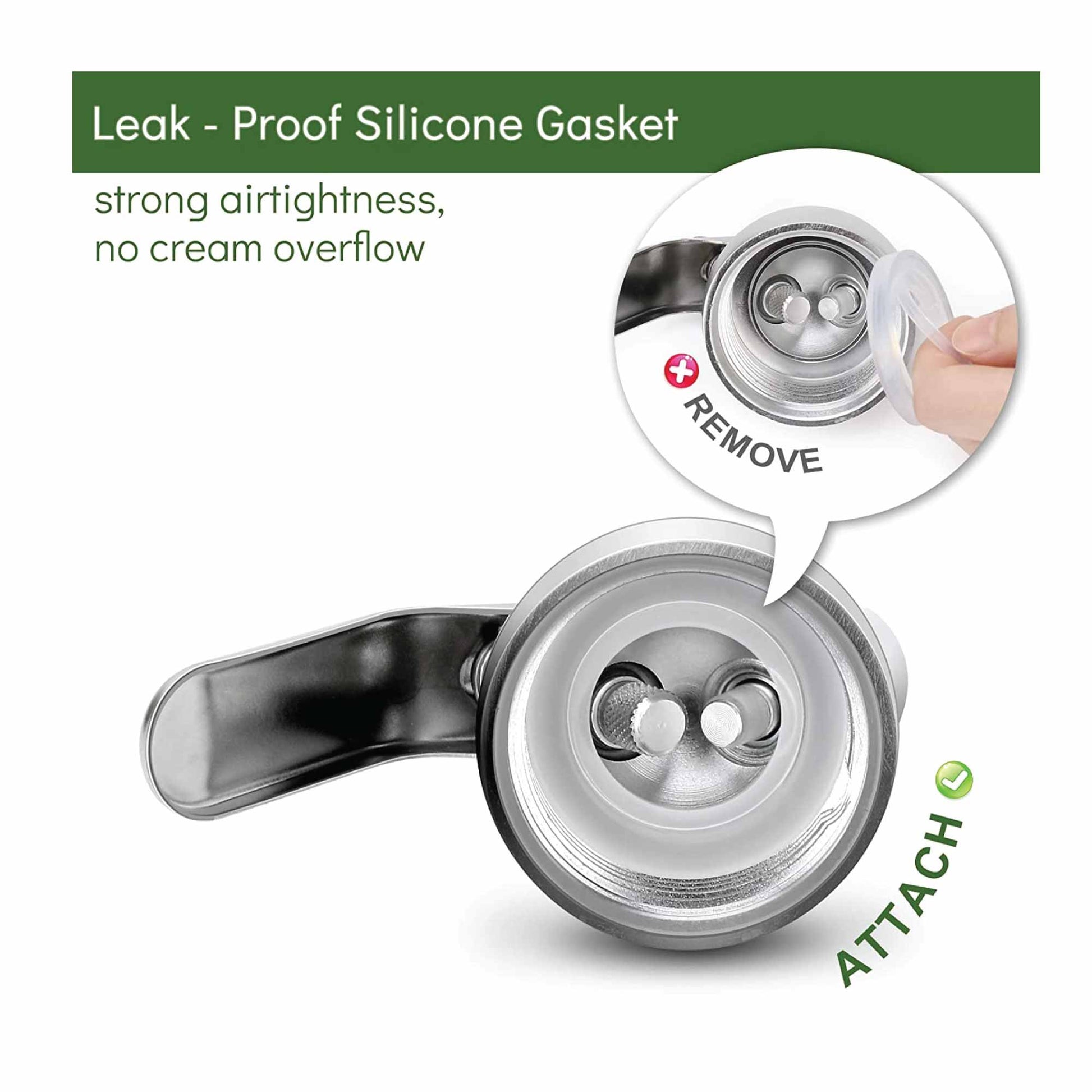 Expect professional-grade whipped cream with this whipped cream dispenser from Great Whip. You can whip up cafe-quality ice cream sundaes, decadent chocolate cakes, frothy latte, soda stream and whipped coconut cream, and many more.