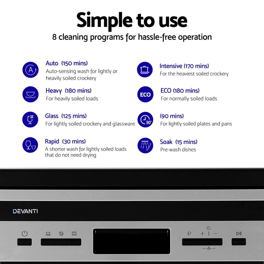 Large capacity, convenient,easy to install, the Devanti Dishwasher is packed with full of great features to make dishwashing a joy rather than a chore.